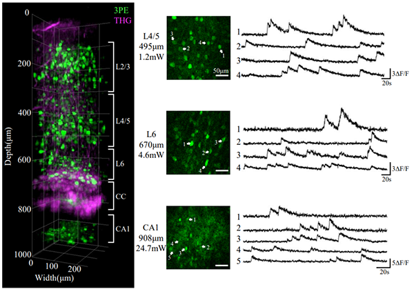 此次,北京大学最新研发的微型化三光子显微镜一举突破了此前微型化多光子显微镜的成像深度极限: